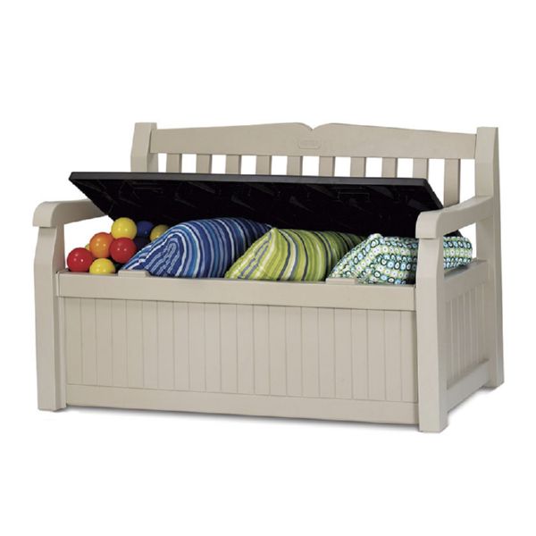 Fabricado resina imitación madera. Almacenamiento inferior 265 litros. Suelo incluido. Refuerzos metálicos en zona asiento. 140x60xh.84 cm. Capacidad: 265 litros.